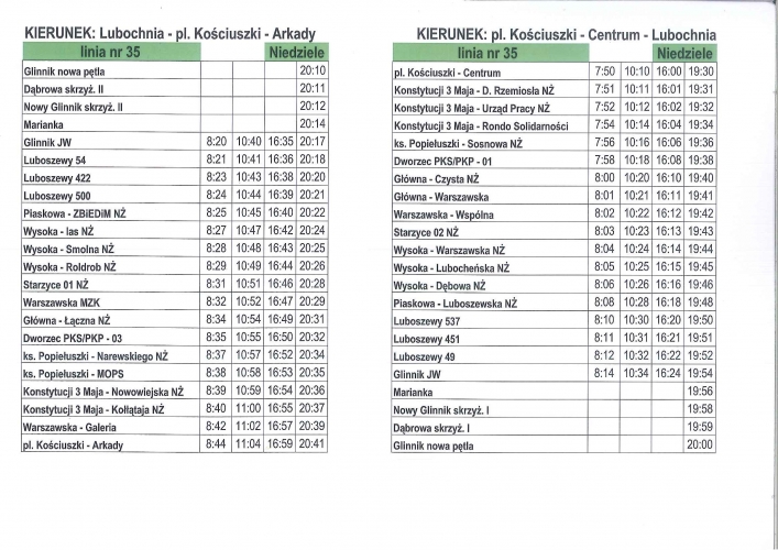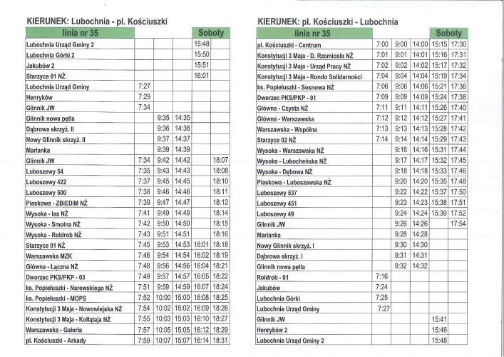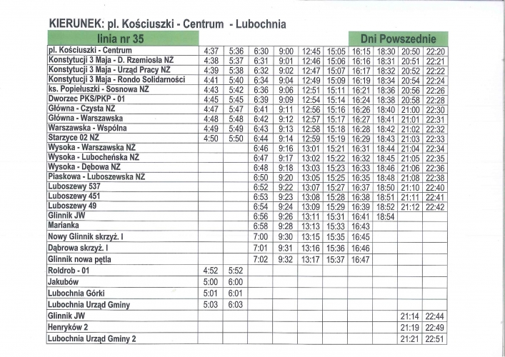 Aktualne rozkłady linii nr 35 Od poniedziałku - 2 lipca 2018 r. wprowadzone zostaną korekty w rozkładzie jazdy komunikacji linia nr 35. URZĄD GMINY LUBOCHNIA INFORMUJE: OD PONIEDZIAŁKU - 2 LIPCA 2018 R. WPROWADZONE ZOSTANĄ KOREKTY W ROZKŁADZIE JAZDY KOMUNIKACJI LINIA NR 35. powrót