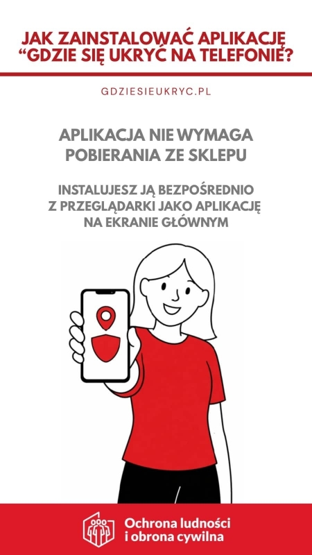 „Gdzie się ukryć” to nowoczesne i przyjazne narzędzie, które może posiadać każdy obywatel. Zostało zaprojektowana z myślą o prostocie i skuteczności: wystarczy telefon komórkowy typu smartfon by w sytuacji nagłego zagrożenia – np. bardzo silnego wiatru czy potencjalnych zagrożenie środkami napadu powietrznego – szybko odnaleźć najbliższe Punkty Schronienia (PS) oraz uruchomić nawigację na mapie. Co ważne, po wcześniejszym pobraniu danych aplikacja działa również w trybie offline.