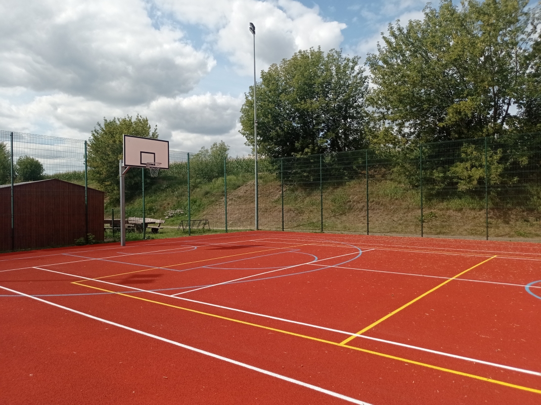 1) Modernizację boiska wielofunkcyjnego o wymiarach 32,10 m x 19,10 m, na którym znajduje się boisko do siatkówki, boisko do piłki koszykowej oraz boisko do tenisa, poprzez:
